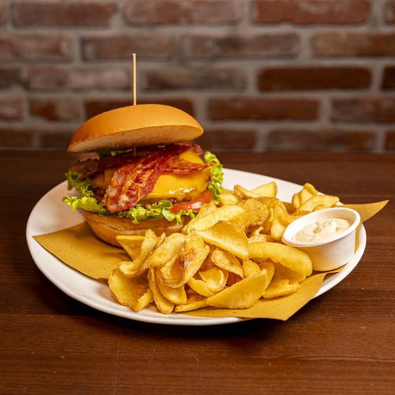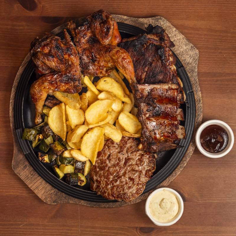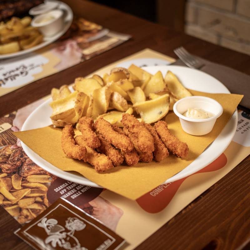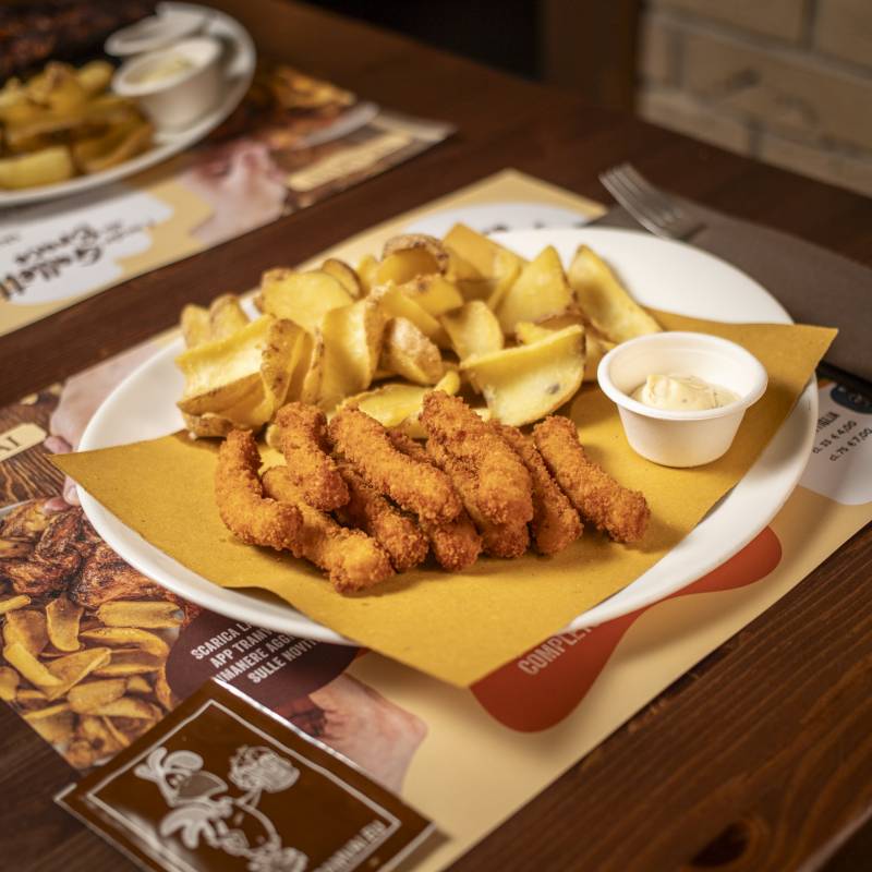 con salse bbq+tramvai+salsa senapata, pane tostato, patatine fritte